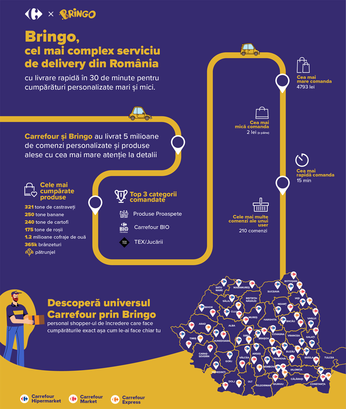 Experiența de comandă Carrefour prin Bringo propune un model unic pe piața din România, în care fiecare sesiune de cumpărături este gestionată de un personal shopper, care alocă aceeași atenție listei de cumpărături, exact așa cum ar face-o clientul însuși. Prin aplicația Bringo, clienții au acces la cumpărături zilnice din magazinele Carrefour, în toate formatele sale, cu opțiuni de livrare standard, de 90 de minute, și rapidă în 30 de minute de la magazinele de proximitate Express.