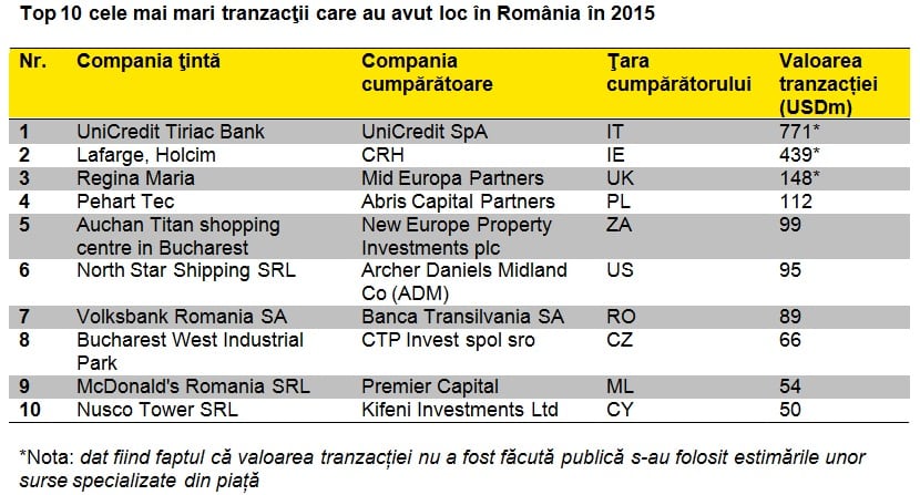 La fel ca in 2014, doar 6% dintre tranzactiile inregistrate au fost facute de investitori romani care au achizitionat tinte externe, unul din cele mai mici procente din regiune, situandu-se la egalitate doar cu Bulgaria si Ungaria.
