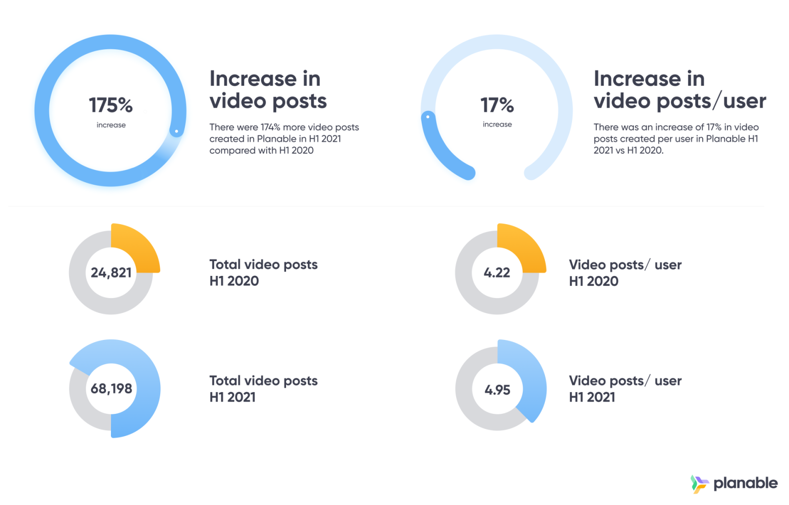 Astfel, Instagram a înregistrat o creștere de 58% a numărului de postări per utilizator comparativ cu aceeași perioadă a anului trecut, clienții Planable, care utilizează platforma de colaborare pentru pregătirea și programarea postărilor pentru social media, demonstrând o preferință evidentă pentru folosirea Instagram pentru a comunica cu urmăritorii lor și pentru promovarea brand-ului. Numărul de story-uri per utilizator pe Instagram a crescut, de asemenea, cu 10% în prima jumătate a anului acesta.
