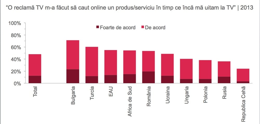 Publicitatea TV este mai eficienta daca este difuzata pe mai multe ecrane. Rezultatele studiului arata ca 50% dintre telespectatorii chestionati au intrat online sa caute un anumit produs sau serviciu imediat dupa ce vazusera reclama respectiva la televizor. Procentul creste la 70% dintre telespectatori in Bulgaria.