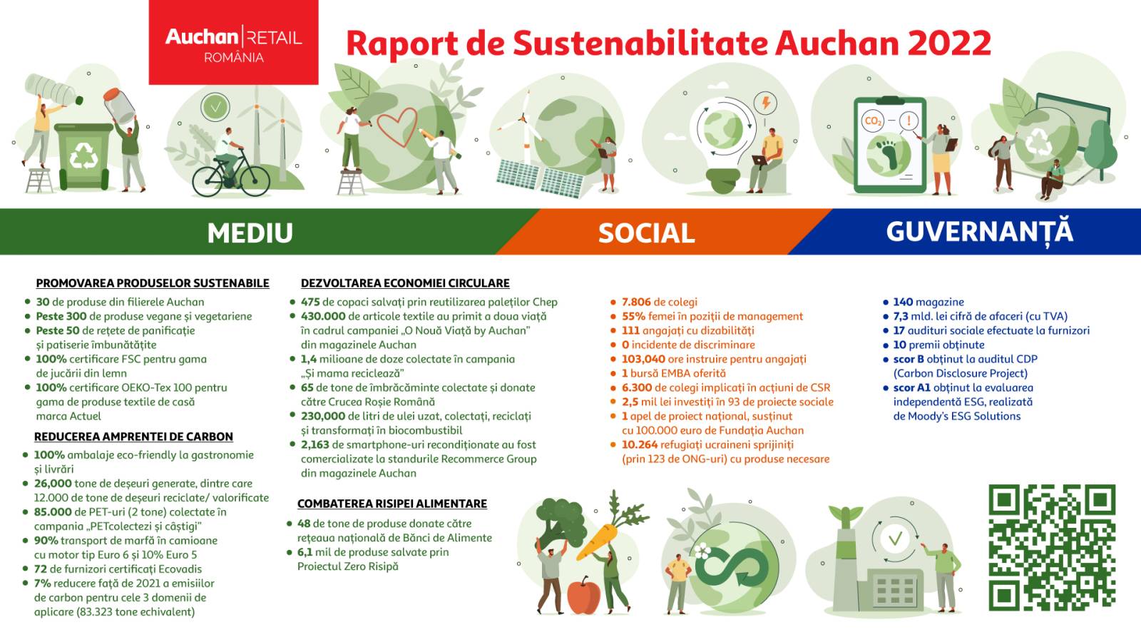 În raport sunt prezentate și date despre companie în calitate de angajator responsabil. În cadrul Auchan România este promovată egalitatea de șanse, angajații având numeroase beneficii și posibilități de dezvoltare. Auchan sprijină egalitatea de gen, iar peste 55% din funcțiile de management sunt ocupate de femei. Anul trecut, Auchan a continuat Programul de Sustenabilitate Personală al angajaților, oferind tuturor celor peste 8 000 de angajați posibilitatea de a se implica în diverse acțiuni de sustenabilitate și responsabilitate socială, la acțiunile demarate în 2022 luând parte peste 6 300 de angajați Auchan România.