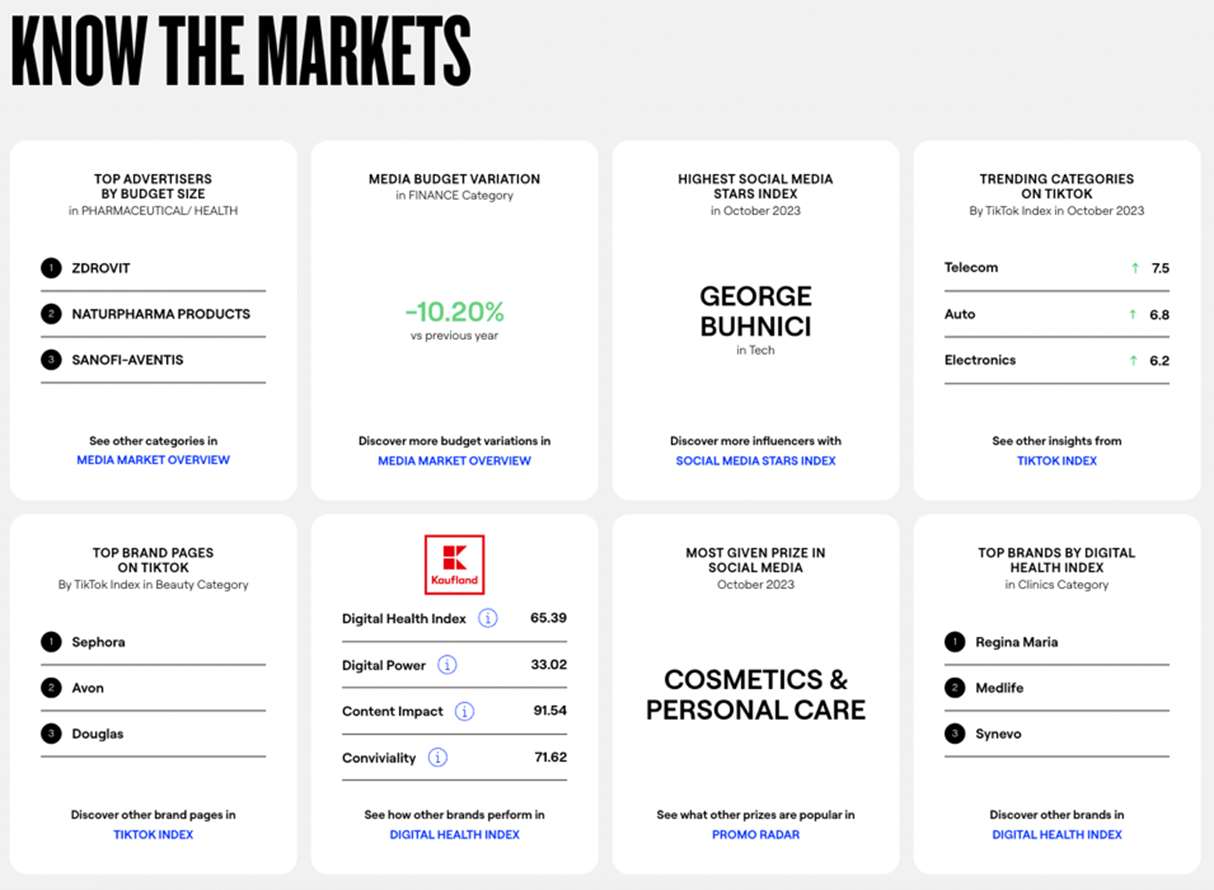 De asemenea, pot accesa clasamente după numărul de share-uri obținute pe TikTok, pentru a înțelege performanța brandurilor pe această platformă sau pot afla care este cel mai sanatos brand in digital in categoria in care activeaza.