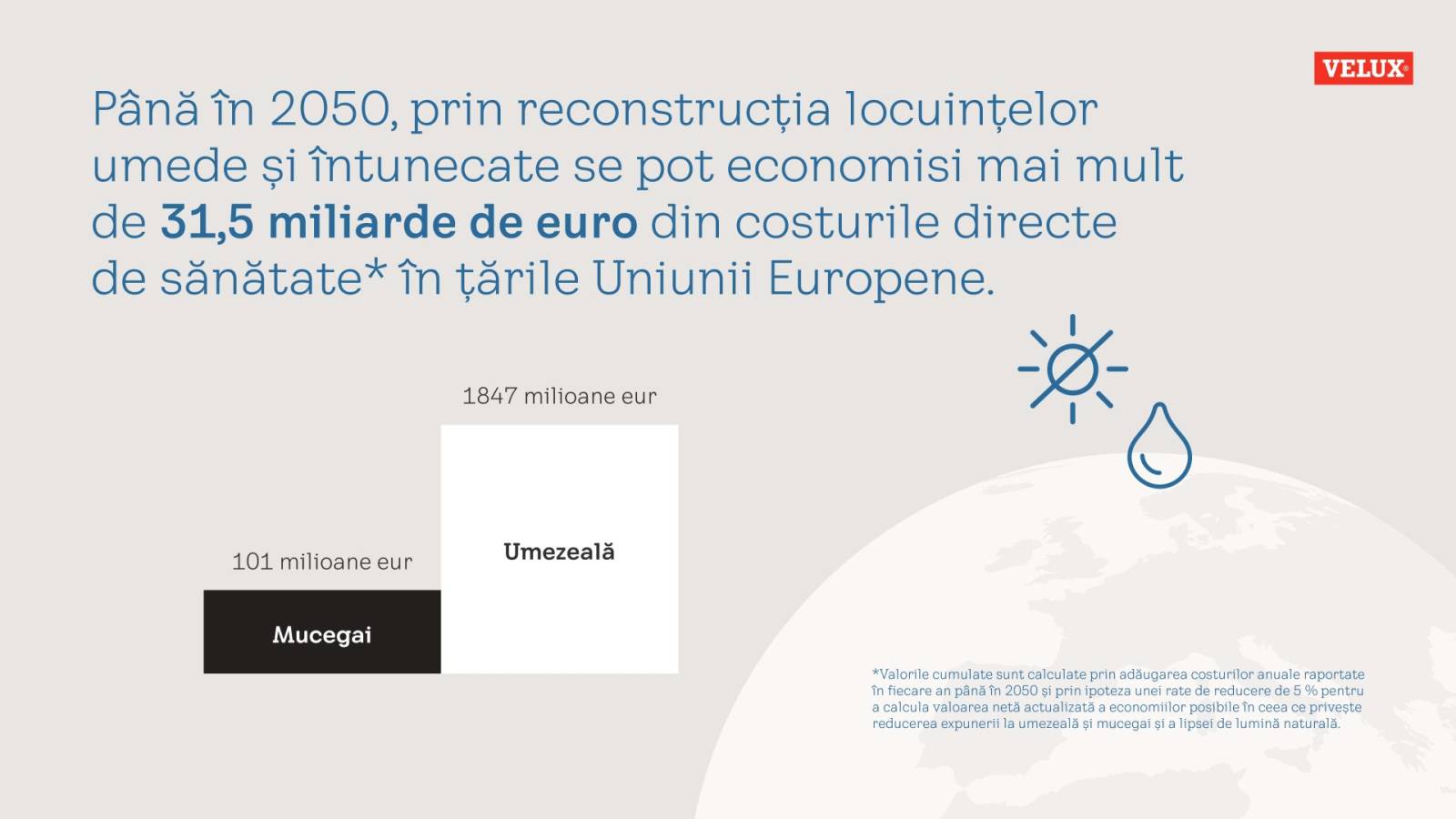 Mai mult, reducerea expunerii la umezeală și mucegai și remedierea lipsei de lumină naturală în clădirile rezidențiale generează beneficii în materie de bunăstare estimate la echivalentul a circa 100 de miliarde de euro pe an în țările UE.