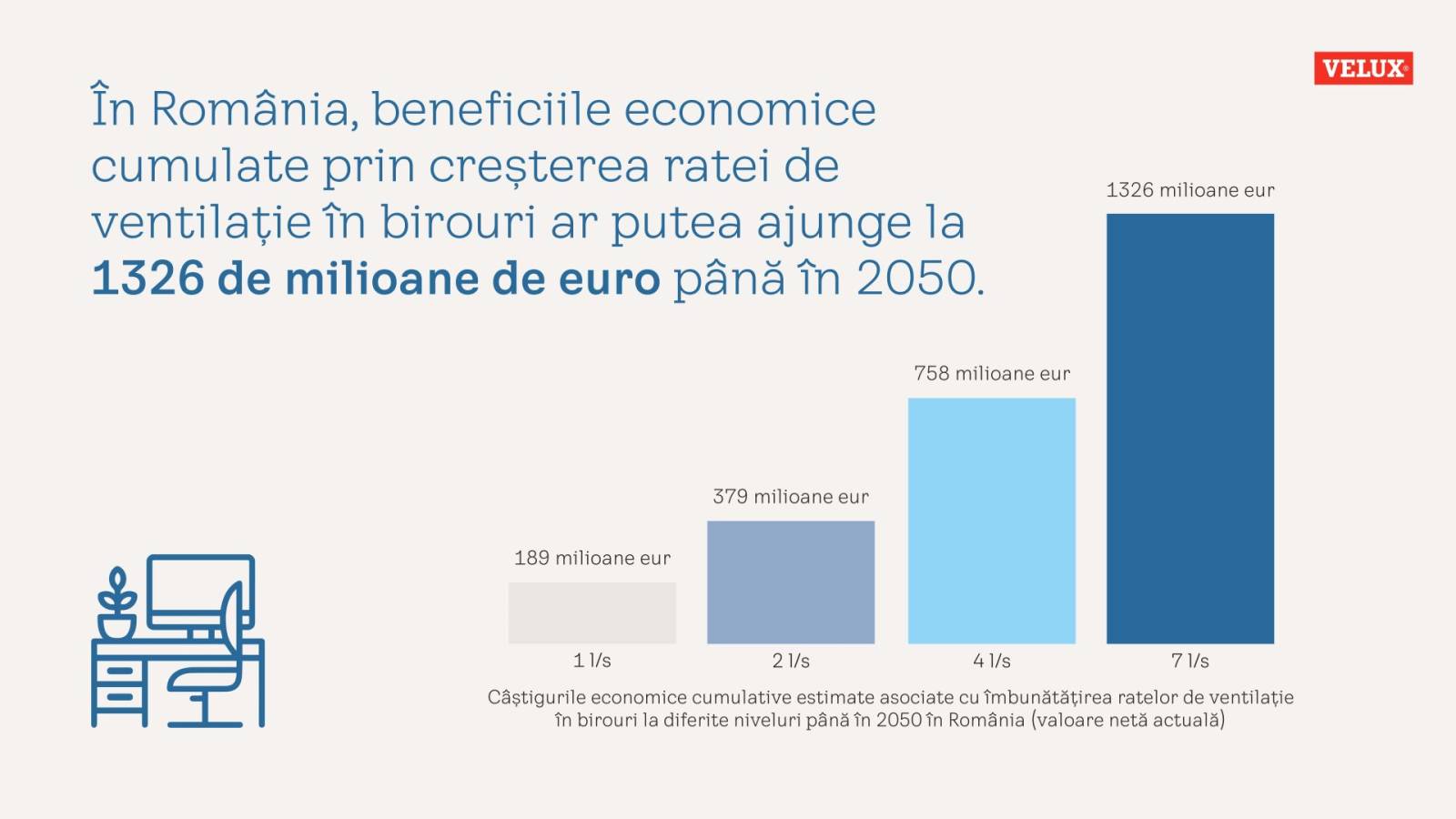 Potrivit studiului VELUX, reducerea riscurilor climatice la interior prin renovarea corespunzătoare a clădirilor ar genera economii totale de peste 6,3 miliarde euro pentru România până în 2050, astfel: 801 milioane euro la cheltuielile cu asistența medicală, 425 milioane euro la sănătate și productivitate, 2,4 miliarde de euro pentru școli și 1,3 miliarde de euro, respectiv 1,4 miliarde de euro pentru birouri, datorită productivității crescute în imobile mai bine ventilate și cu mai multă lumină naturală.