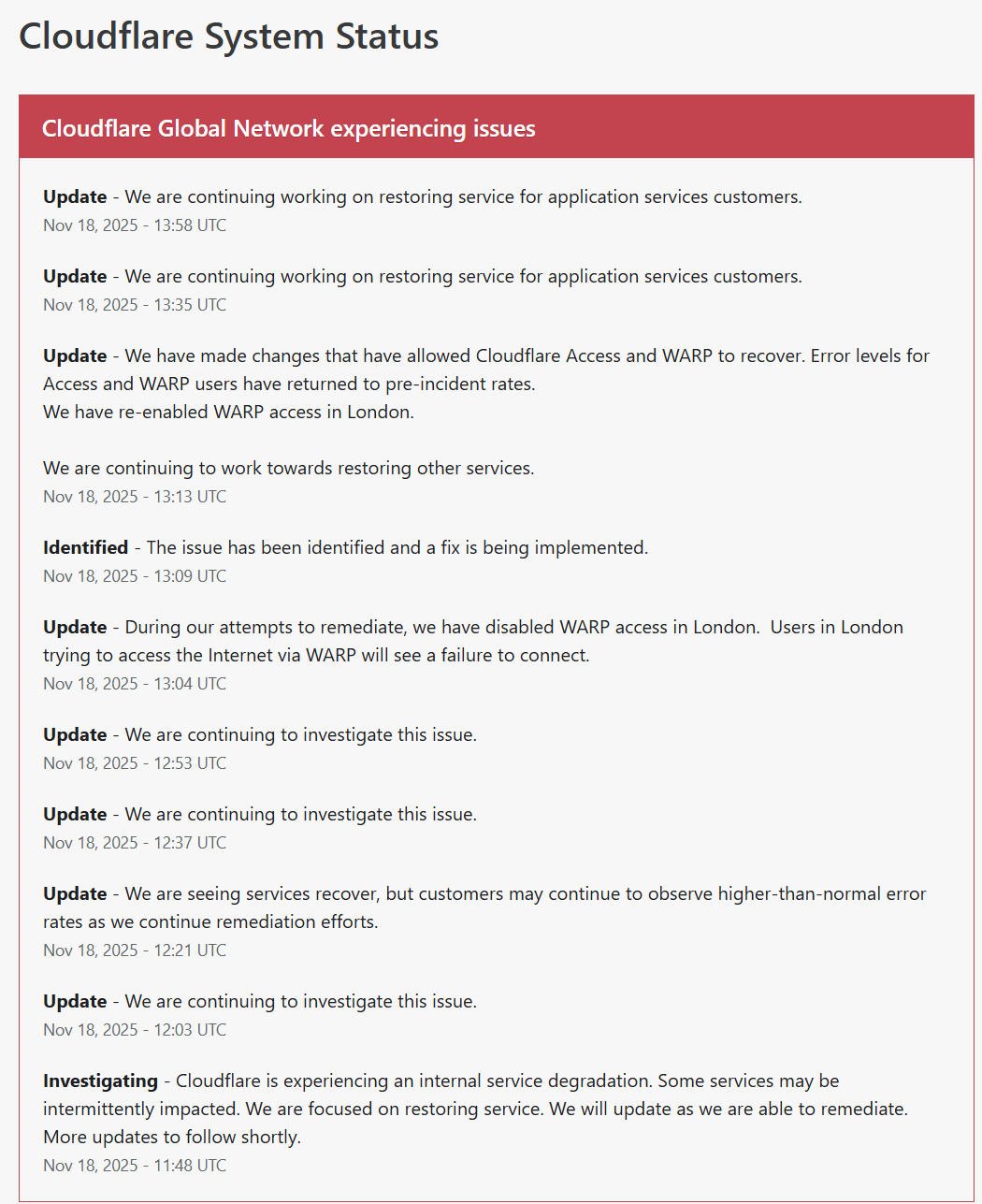 Reprezentanții Cloudflare au comunicat pe pagina de status a serviciului că au identificat problema și că se așteaptă rezolvarea acesteia, dar în acest timp mai multe servicii de internet funcționează deficitar, iar utilizatorii văd mesaje de eroare.