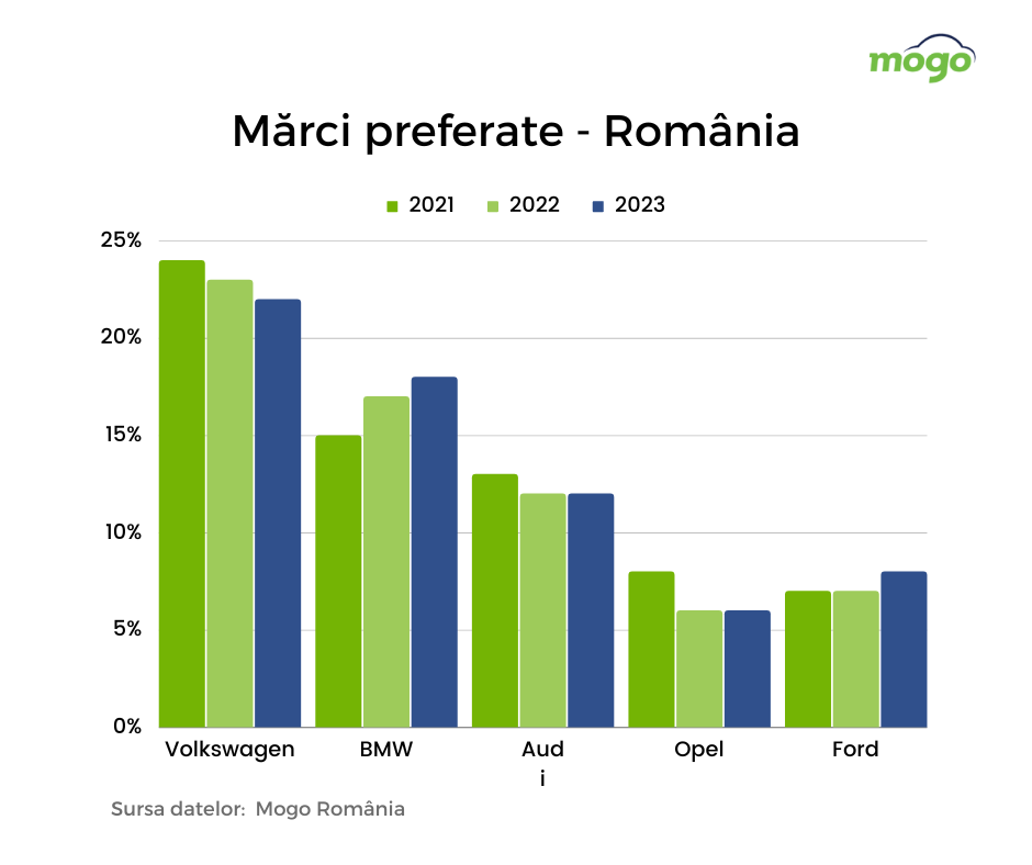 BMW, Volkswagen și Audi au dominat podiumul preferințelor în toate cele cinci țări investigate. Deși Volkswagen continuă să fie alegerea principală în România și Moldova, procentul de achiziții în România a scăzut de la 24,4% în 2021, la 21,9% în 2023. În Lituania și Letonia, Volkswagen ocupă poziția a treia în preferințele de achiziție, cu cote de 13,9%, respectiv 12,9%, dar în ambele cazuri cu scăderi notabile față de anii precedenți, de 4,1% și 3,1%. În schimb, Estonia se distinge printr-o creștere semnificativă a achizițiilor de mașini Volkswagen, de la 11,7% în 2021 la 14,9% în acest an.