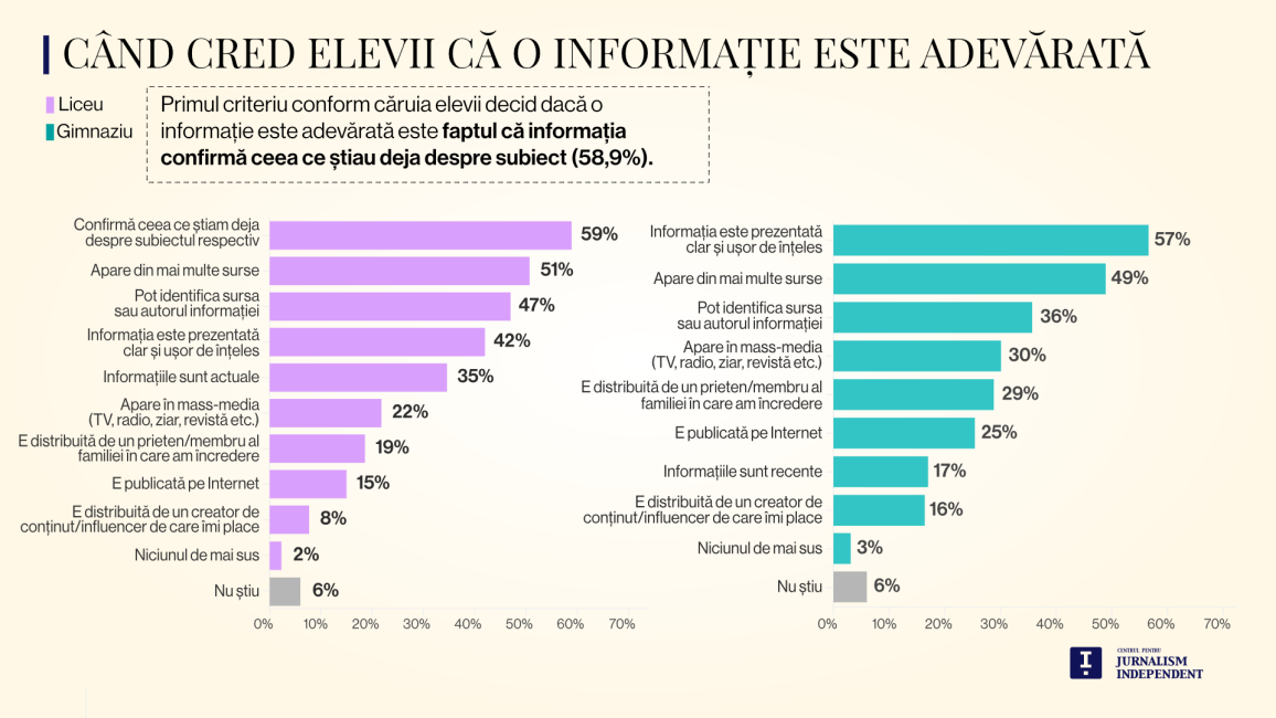 În ceea ce privește încrederea tinerilor în informații, cercetarea relevă că cei mai mulți dintre aceștia, adică 6 din 10 cred că o informație este adevărată dacă confirmă ceea ce știau deja despre subiectul respectiv, adică biasul de confirmare, o tendință cognitivă umană confirmată de știință. Jumătate dintre tineri consideră că dacă informația apare din mai multe surse sau dacă pot identifica sursa sau autorul informației aceasta este adevărată.
