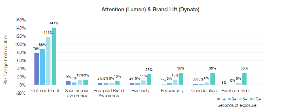O Atenție ridicată determină rezultate bune și constante la nivelul întregului funnel, inclusiv de la mijlocul „pâlniei” în jos. Impactul pozitiv al Atenției asupra obiectivelor din partea inferioară a funnelului a reprezentat o creștere de 30% în urma expunerilor cu o durată de peste 10 secunde.