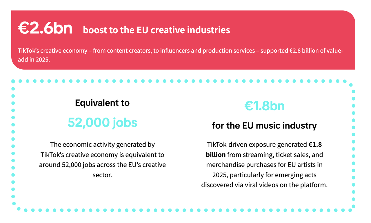 Industria muzicală a beneficiat în mod deosebit de TikTok ca platformă de descoperire, generând 1,8 miliarde de euro în venituri suplimentare, datorită streaming-ului, concertelor live și merchandising-ului. Pentru artiștii aflați la început de carieră, TikTok joacă un rol tot mai important în a-i ajuta să își construiască audiențe și cariere durabile.