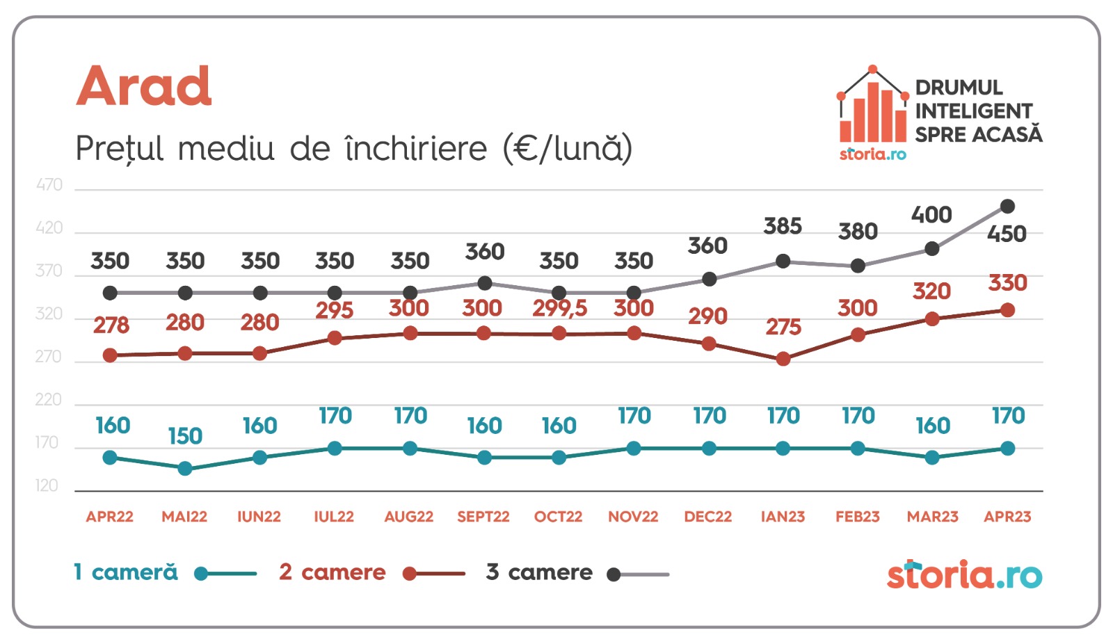 Prețurile medii pentru chirii au crescut atât în cazul garsonierelor (6%), cat și în cazul apartamentelor cu două camere (3%) și al apartamentelor cu trei camere (13%). În luna aprilie, prețul mediu de închiriere pentru garsonierele din Arad a fost de 170 de euro, revenind la valoarea medie din lunile precedente. Costul mediu de închiriere pentru apartamentele cu două camere a fost de 330 de euro, cel mai mare de până acum, iar prețul apartamentelor de trei camere a ajuns la 450 de euro, o creștere semnificativă față de luna anterioară (+13%), precum și față de aceeași lună a anului trecut (+29%).