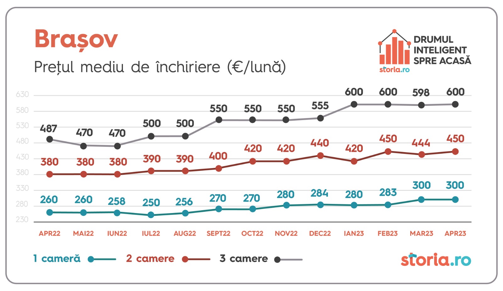 Prețul mediu de închiriere pentru apartamentele cu două camere a crescut cu 1% în Brașov, ajungând la 450 de euro/lună, în timp ce garsonierele și apartamentele cu trei camere au rămas la un preț mediu de închiriat similar cu cel din luna anterioară.