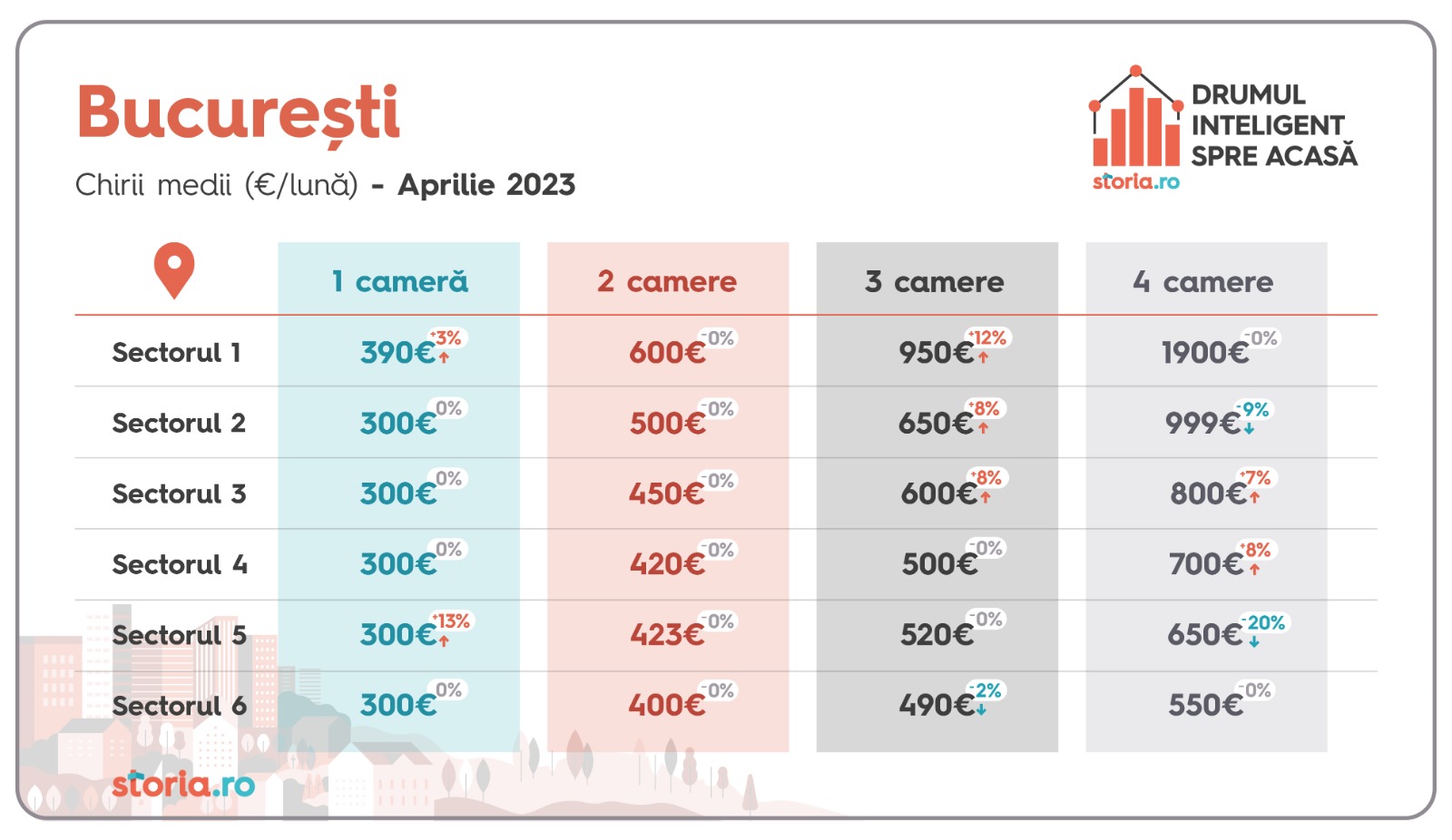 Cea mai mare creștere a prețului mediu se observă la garsonierele din sectorul 5, unde au crescut cu 13% față de luna anterioară, de la 266 euro la 300 euro. Cea mai mare scădere, de 20%, se înregistrează tot în sectorul 5, la apartamentele cu patru camere, unde prețul mediu a ajuns de la 808 euro la 650 euro.