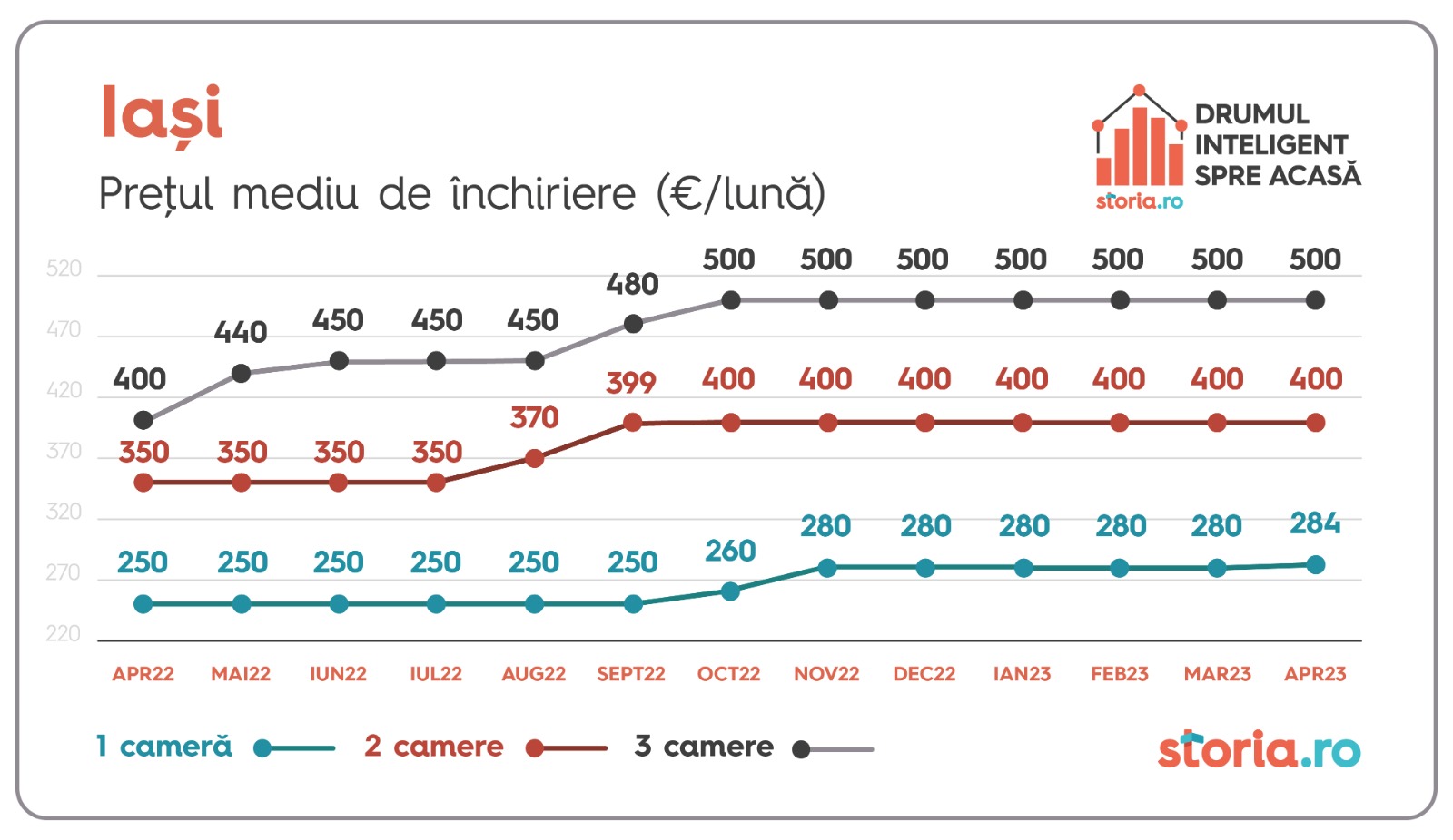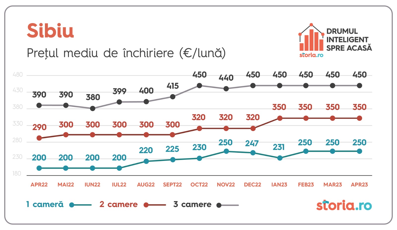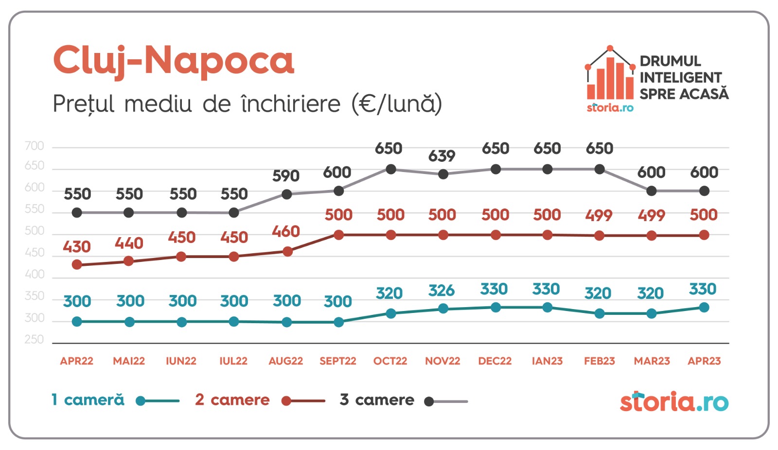 În Cluj-Napoca, chiriile medii au rămas constante de la o lună la alta pentru apartamentele cu două și trei camere, în timp ce prețul mediu de închiriere pentru garsoniere a crescut cu 3% față de luna anterioară, de la 320 de euro ajungând la 330 euro.