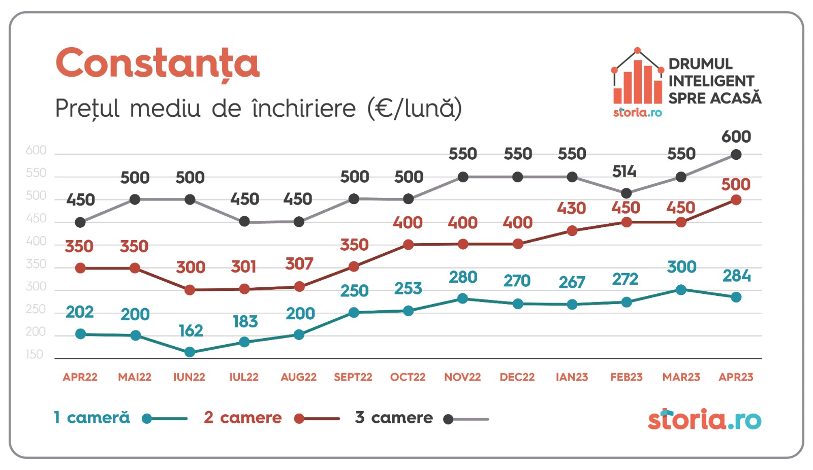 În Constanța s-au înregistrat creșteri în cazul apartamentelor cu două camere (11%), de la 450 de euro la 500 de euro, dar și la apartamentele cu trei camere (9%), unde prețul mediu de închiriere a ajuns la 600 de euro. În cazul garsonierelor, prețul mediu de închiriere a scăzut cu 5%. Remarcăm că, într-un singur an, prețul mediu de închiriere pentru apartamentele cu două camere din Constanța a crescut cu 43%.