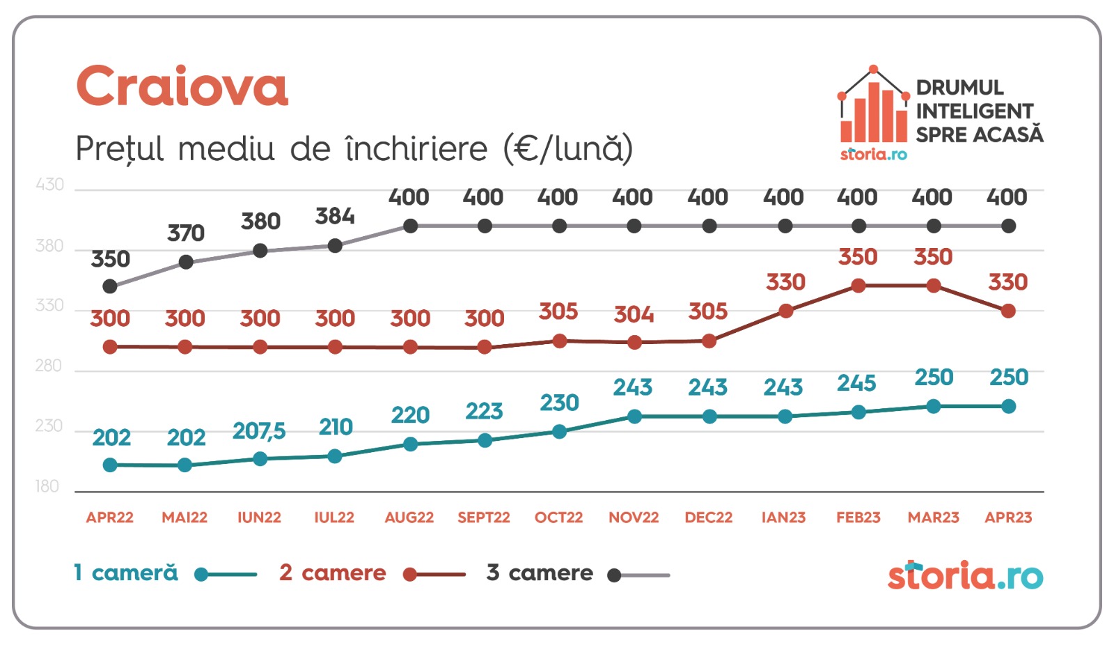 În Craiova s-au înregistrat stagnări în cazul garsonierelor și apartamentelor cu trei camere, în timp ce prețul mediu al apartamentelor cu două camere a scăzut cu 6%, de la 350 de euro ajungând la 330 de euro.