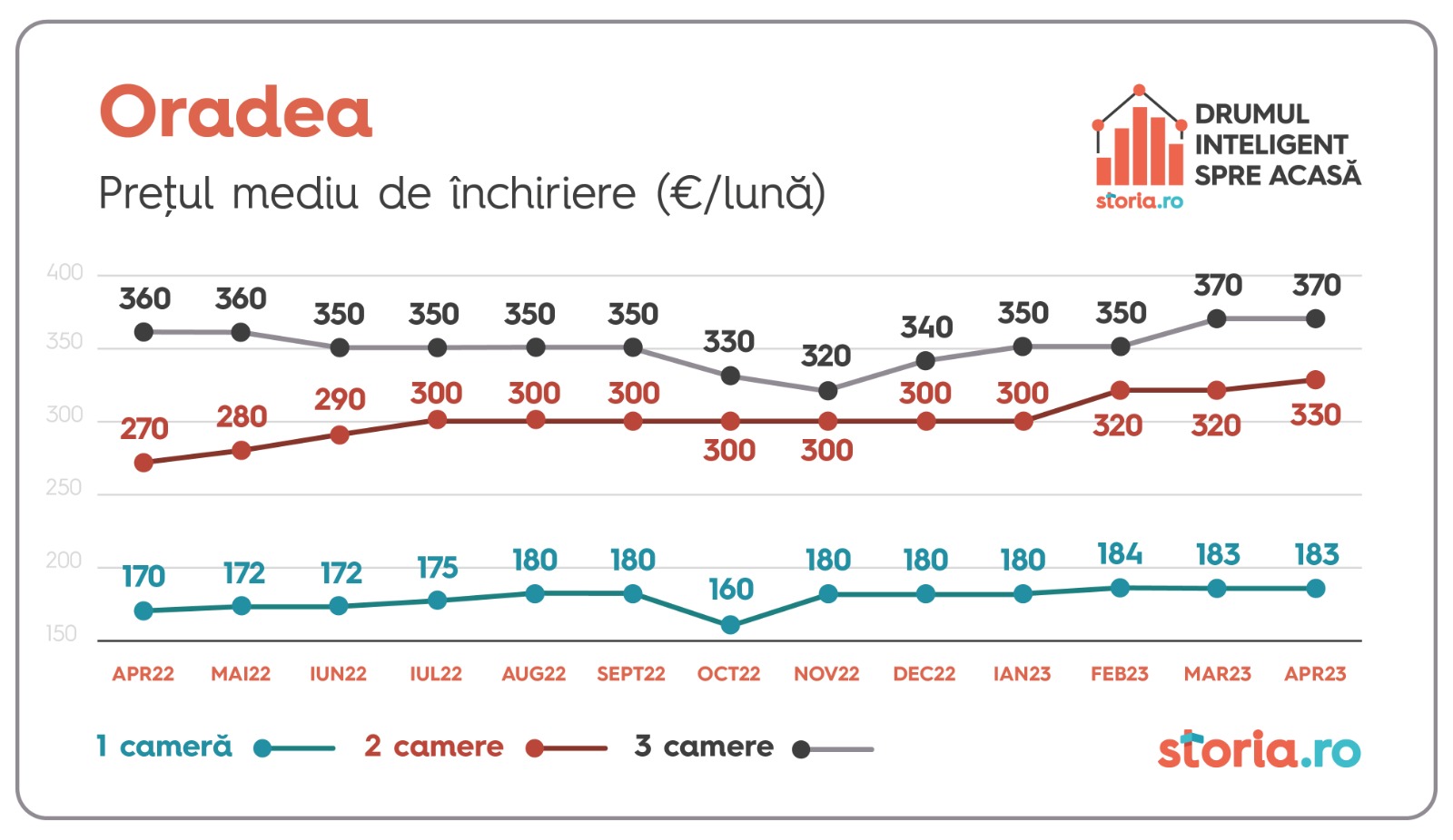 În Oradea s-a majorat cu 3% prețul mediu al apartamentelor cu două camere, de la 320 de euro la 330 de euro, în timp ce prețul mediu al garsonierelor și al apartamentelor de trei camere a rămas în general stabil.
