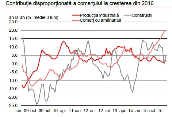 Potrivit analistilor UniCredit, in acest an, cresterea de doua cifre a vanzarilor cu amanuntul va contrasta cu evoluţia modesta a productiei industriale si constructiilor. Cresterea investitiilor publice in primele sase luni din 2016 este explicata de efectul de baza generat prin comparatia cu cheltuielile reduse de infrastructura in aceeasi perioada din 2015. Intrarile reduse de fonduri UE la inceputul noii perioade de bugetare 2014-2020 vor afecta investitiile publice in a doua parte a anului 2016, iar politica fiscala va avea, probabil, un efect negativ asupra cresterii economice din 2017. In acelasi timp, Romania este una dintre putinele tari din Europa Centrala in care preturile locuintelor nu au crescut in perioada de dupa 2009, ceea ce a avut un efect negativ asupra proiectelor imobiliare noi.