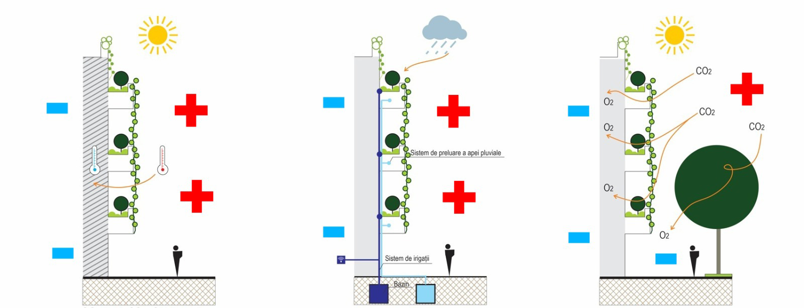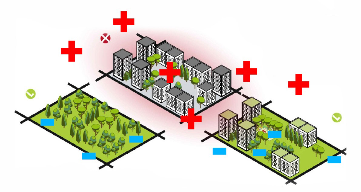 - Crearea de acoperișuri verzi și grădini suspendate cu trei efecte imediate: izolarea termică a blocurilor atât iarna dar mai ales vara, absorbția de energie solară datorită procesului natural prin care plantele absorb și eliberează apă, având un efect răcoritor asupra mediului, ceea ce conduce la răcorirea ambientală, respectiv crearea de beneficii ecologice precum filtrarea poluanților din aer, reducerea scurgerilor de apă de ploaie și crearea unor microhabitaturi pentru biodiversitate. Impact estimat: 0,6-0,8°C.