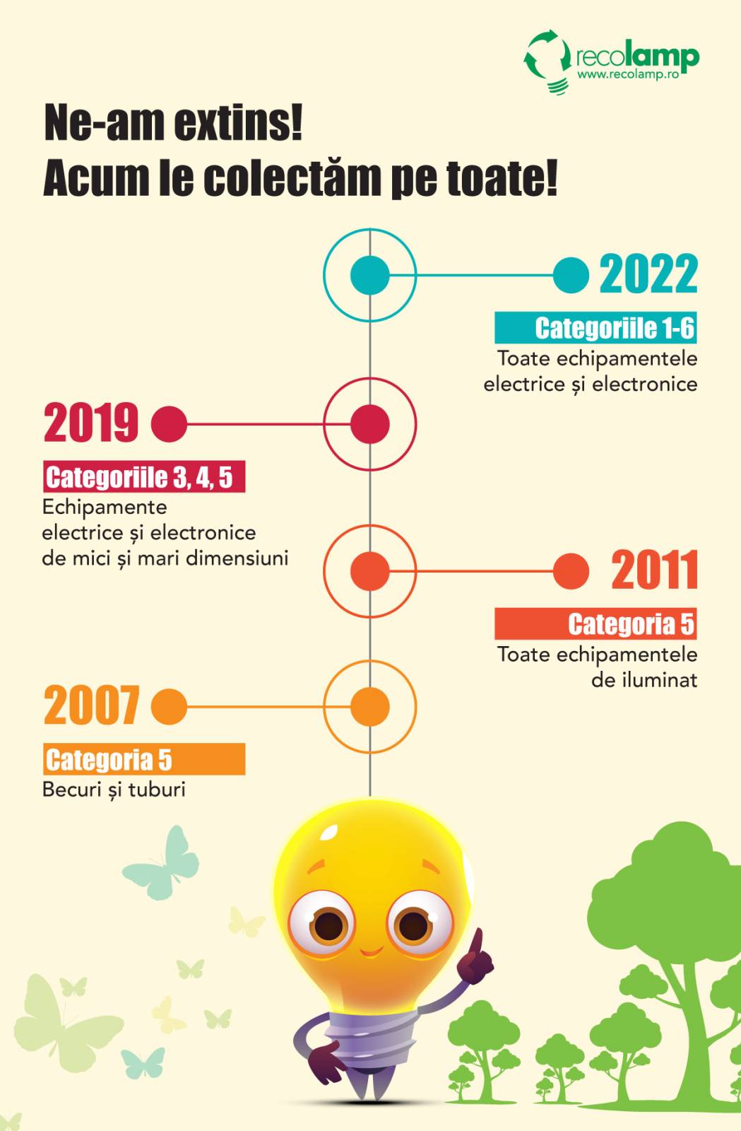Astfel, după 15 ani de activitate consistentă pe piața colectării și reciclării deșeurilor din echipamente de iluminat, Asociația Recolamp își extinde activitatea la toate categoriile de DEEE-uri, prevăzute în legea nr. 5/2015, și anume: echipamente de transfer termic, ecrane, monitoare şi echipamente care conţin ecrane cu o suprafaţă mai mare de 100 cm2, echipamente de mari dimensiuni (având oricare dintre dimensiunile externe mai mare de 50 cm), echipamente de mici dimensiuni (nicio dimensiune externă mai mare de 50 cm), echipamente informatice şi de telecomunicaţii de dimensiuni mici (nicio dimensiune externă mai mare de 50 cm)