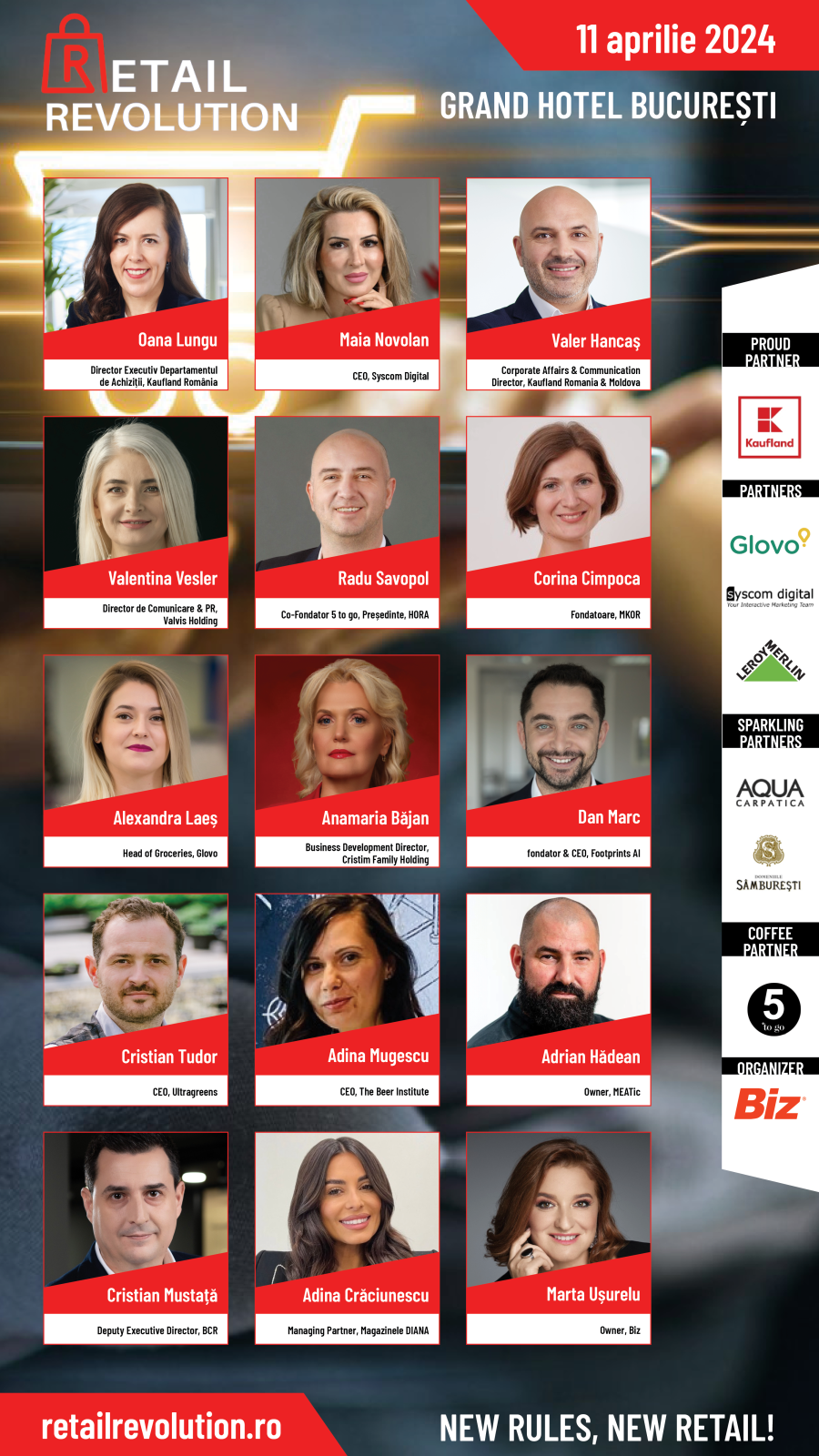 În cadrul conferinței Retail Revolution, organizată de revista Biz pe 11 aprilie, la Grand Hotel București, participanții au ocazia să descopere cele mai recente tendințe, soluții și strategii care vor oferi o cale de a naviga cu succes prin aceste vremuri pentru a propulsa afacerile către succes.